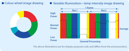 By employing the colour wheel with six segments (red, green, blue, cyan, white and yellow) and BrilliantColor with superior reproducibility of neutral colours, images of natural scenery can be projected more vividly. Furthermore, variable colour reproduction according to the purposes of use is available by employing Variable Illumination, a technology varying the lamp intensity being irradiated to the respective segments of the colour wheel. NEC provides a setting that emphasizes the colour yellow.