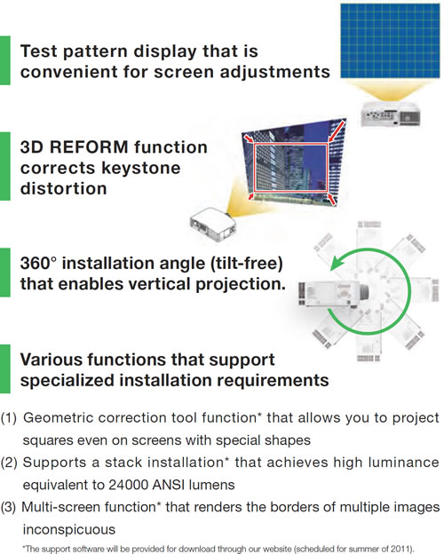 Five types of optional lenses and a wide lens shift range provides improved flexibility of your installation.