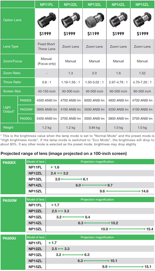 The projector supports five types of optional lenses which are adapted to a variety of installation locations and projection methods, including conference rooms, auditoriums, and exhibition halls. The NP13ZL is compatible with 2x zoom, which allows it to handle an even PA600X broader range of projection distances. The lenses can be easily changed by using the lens release button.