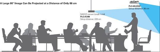 - The ultra short-focus lens enables projection of a large 80-inch image from a distance of only 86 cm. This permits enjoyable large-screen presentations to be given in a shorter focal distance.