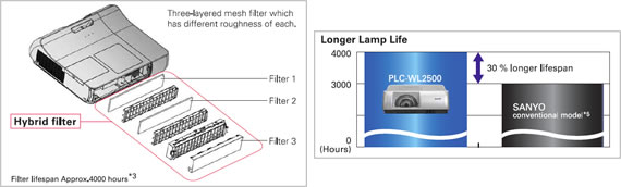 - The lamp lifespan has been improved by about 30% compared to our conventional model*2, and does not need to be replaced for approximately 4,000 hours*3, thereby greatly reducing the inconvenience of product maintenance. The longer lamp lifespan, also makes it more eco-friendly, with a smaller impact on the environment.