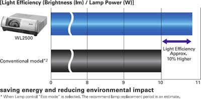 - Since light efficiency has been improved by about 10%*4 compared to our conventional model*2, the PLC-WL2500 produces brighter and more beautiful images, while saving energy and reducing environmental impact.