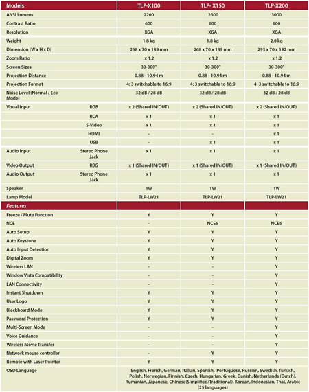 the TLP-X100, 2600lm for the TLP-X150 and 3000lm for the TLPX200